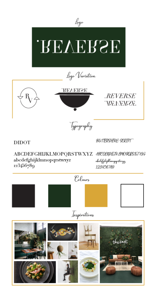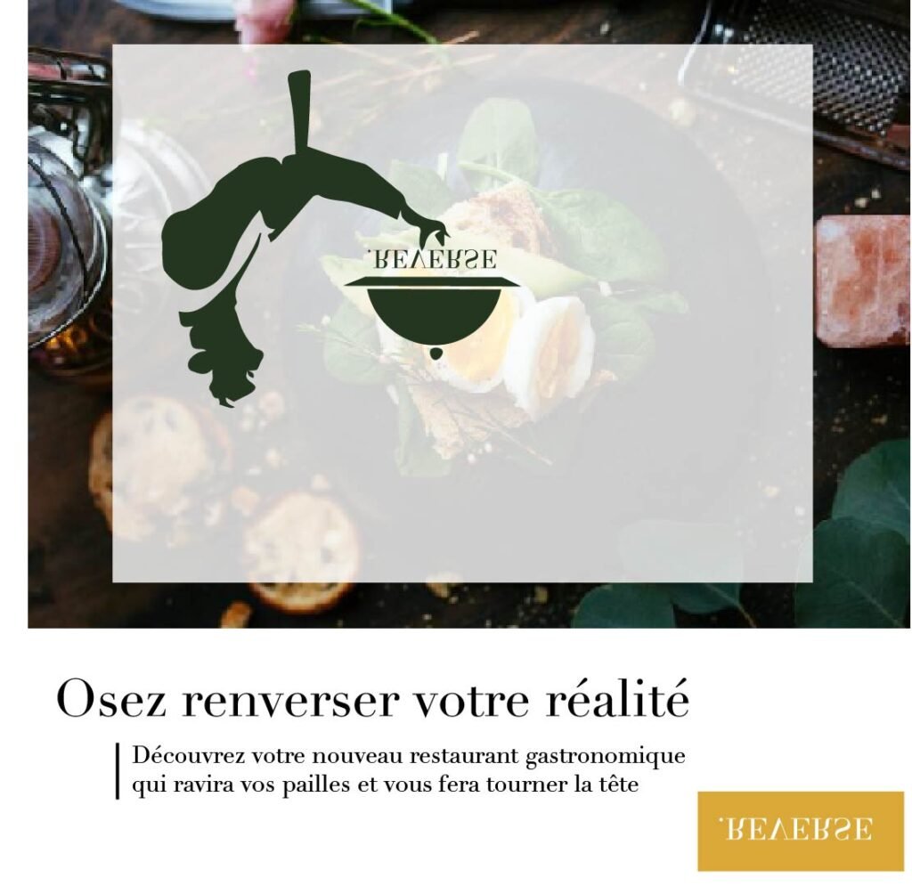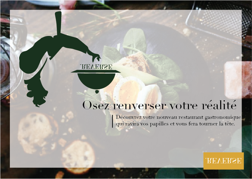 Le projet d’identité visuelle, conçu avec mon groupe en première année, consistait à créer l’univers graphique d’un restaurant au concept totalement renversant. Notre idée était de proposer une expérience inédite où tout serait inversé : la décoration, le déroulement des repas (par exemple, commencer par le dessert) et l’ambiance générale. Pour ce faire, nous avons élaboré un logo original avec ses déclinaisons et créé des illustrations ludiques pour les panneaux, kakemonos et autres supports de communication. Nous avons également développé la signature mail et d’autres éléments visuels pour assurer une cohérence graphique globale. En utilisant Illustrator, nous avons respecté les codes du graphisme tout en imaginant une identité visuelle moderne et surprenante, en parfaite adéquation avec le concept unique de notre restaurant.